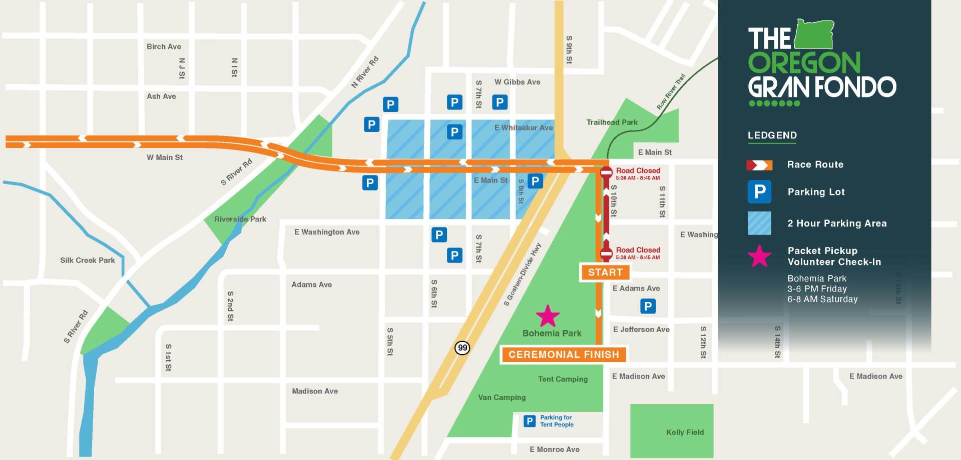 Enjoy your day before or after the Oregon Gran Fondo. Friday packet pickup at Bohemia Park 3-6 off of S 10th and Main.